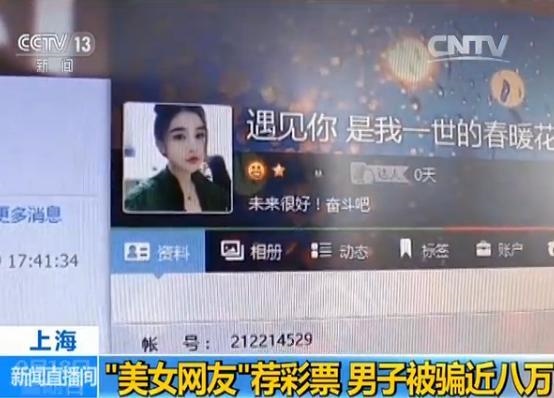 上海市的林先生网络聊天遇上美女主动搭讪,攀谈之间对方推荐了一个所谓“中奖率高”的彩票网站。于是,林先生前前后后投入了近八万元,购买对方推荐的彩票,结果大奖落空,林先生这才明白自己是被骗了。